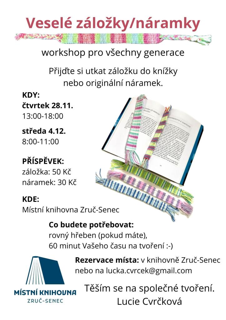 Rezervace místa v knihovně, na tel. 602241786 nebo na mailu lucka.cvrcek@gmail.com